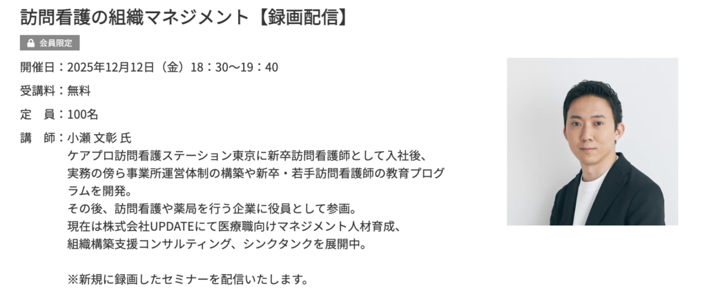 この度、弊社の代表である小瀨が、NsPace(ナースペース)様主催のオンラインセミナー「訪問看護師のためのオンラインセミナー」に登壇することが決定しました。