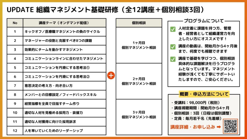 医療職経営者やマネージャーに必要となる、組織マネジメントの要点を身につけるオンデマンド講座+個別実務相談によるディスカッションで構成されています。